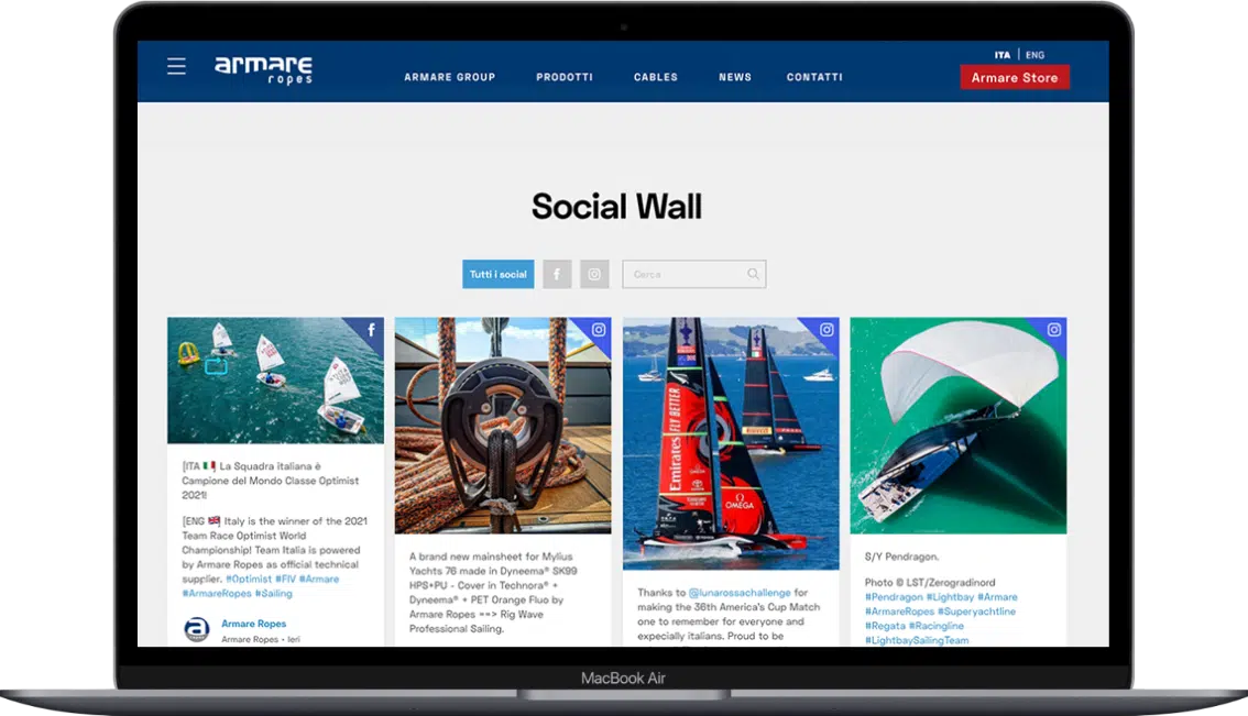 In occasione dell’America’s Cup 2021 abbiamo progettato un restyling completo della presenza digitale del brand, con due nuovissimi website. Un sito istituzionale del brand, ricco di contenuti e ancora più bello, dinamico e facile da consultare, si affianca al sito e-commerce per l’acquisto online delle cime Armare Ropes.