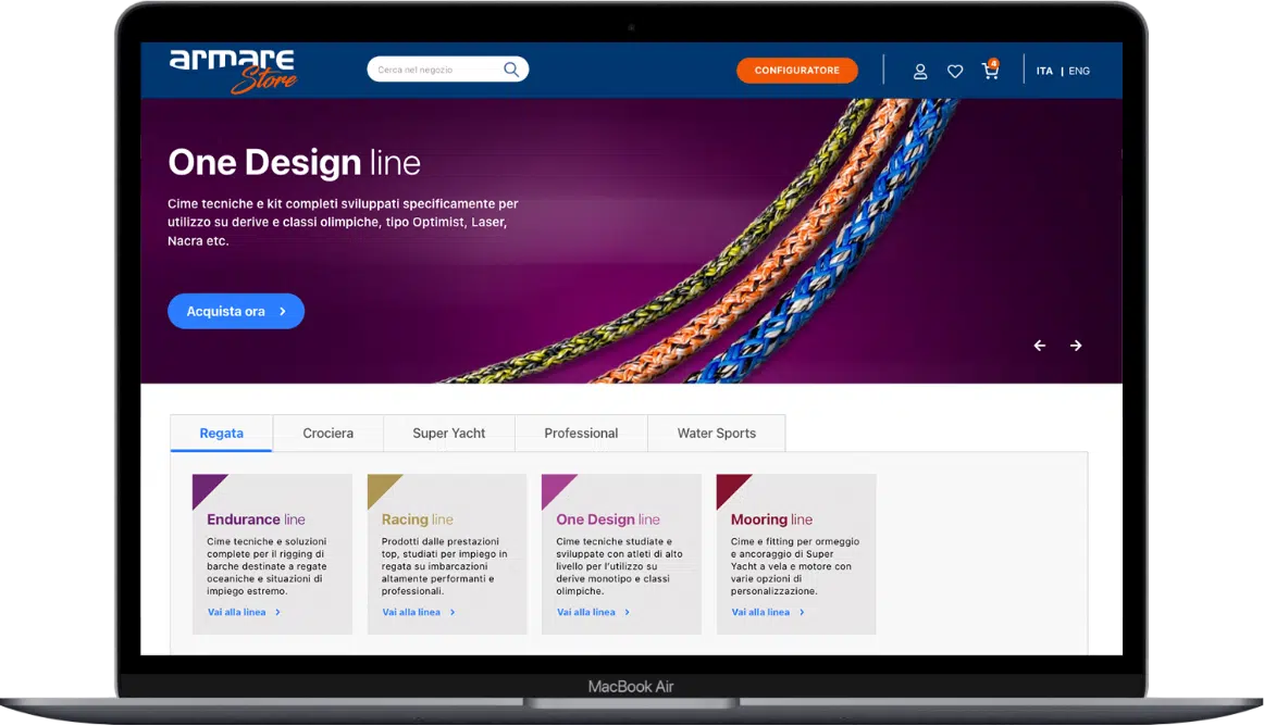 Armare Ropes è un’azienda di rilievo internazionale nel settore delle cime nautiche per imbarcazioni a vela e motore e storico cliente di Five Studio, che da anni si occupa non solo dell’ecosistema digitale dell’azienda ma anche di tutta la brand identity e della comunicazione offline.La qualità dei prodotti ha portato Armare Ropes anche alla conquista delle ultime due edizioni dell’ America’s Cup come Official Supplier di Emirates Team New Zealand e alla riconferma per la prossima campagna di Coppa America. Proprio in occasione dell’ultima campagna di Coppa America abbiamo pubblicato il nuovo ecommerce del brand, che va ad affiancare il sito corporate. + Read more